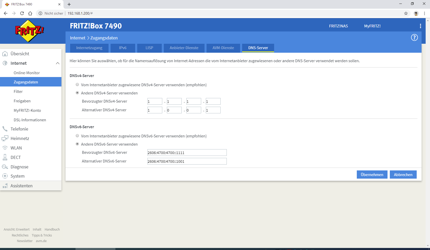 Ich habe den DNS Server auf meiner Fritzbox wie folgt geändert.